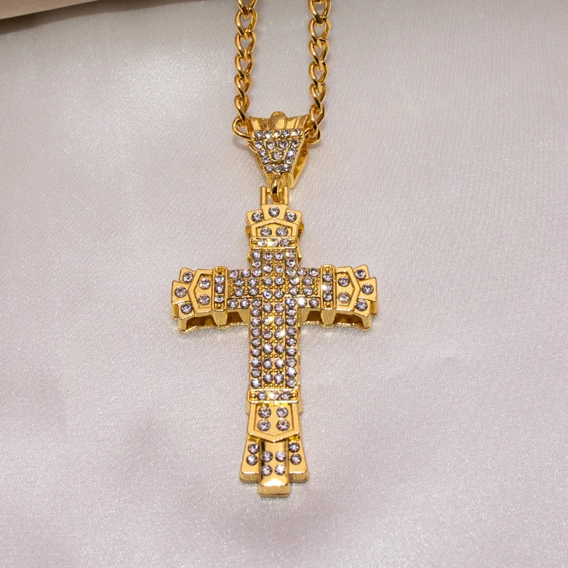 This men's necklace showcases a sparkling rhinestone Christian cross pendant crafted from zinc alloy, available in gold or white. Measuring 58cm in length with a 3.5cm by 5.2cm pendant, it weighs approximately 31g. Designed to stand out, this durable chain adds a bold, fashionable edge to any look. Ideal for those who want to express their style with confidence, this necklace is a striking accessory you won’t want to miss. Order now to elevate your wardrobe!