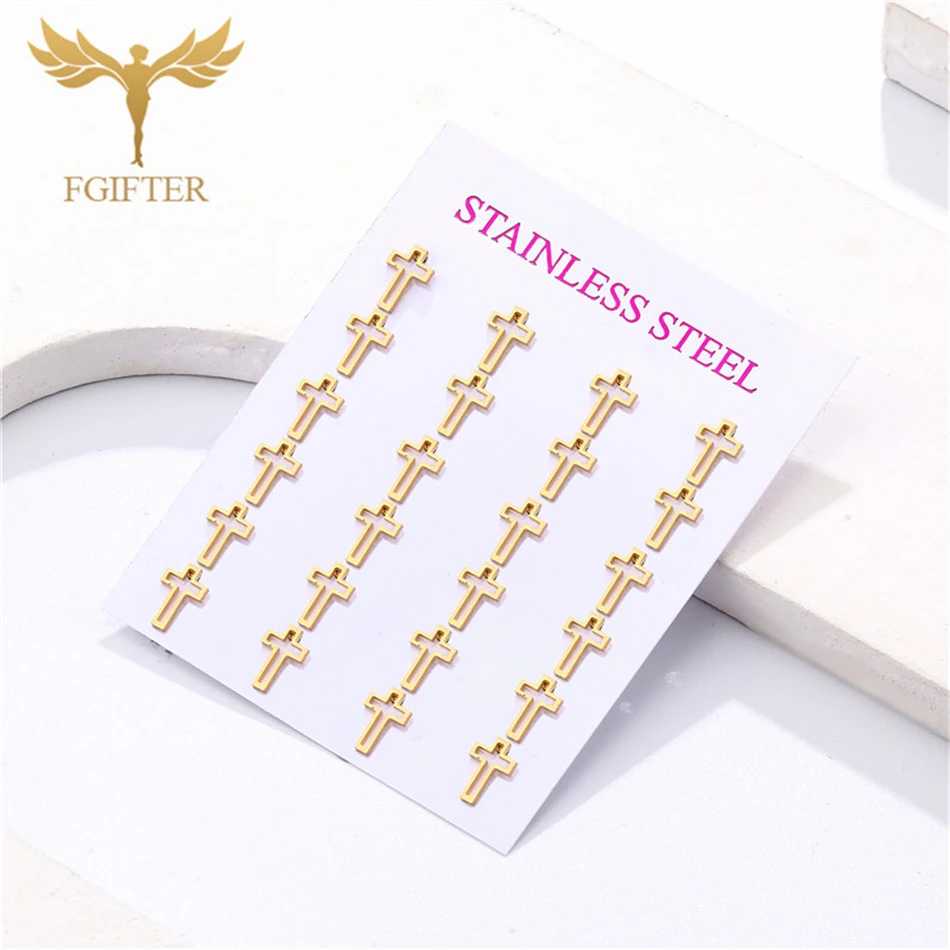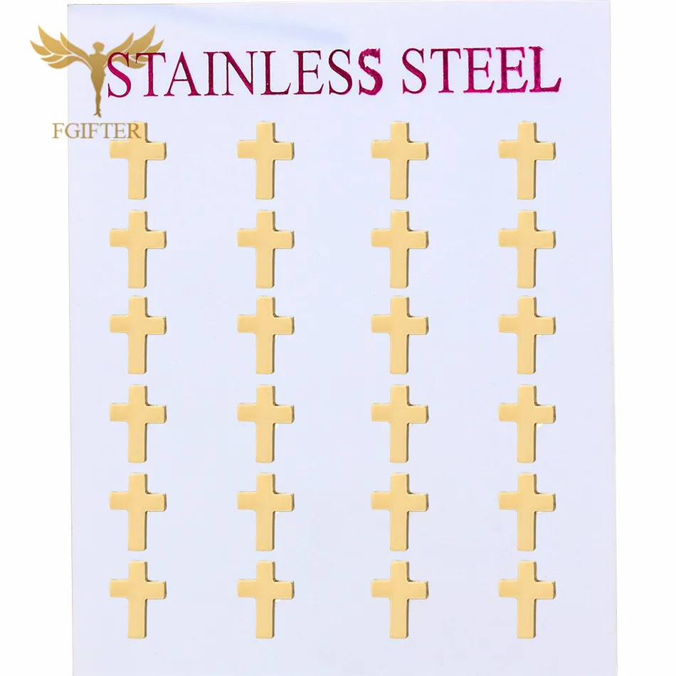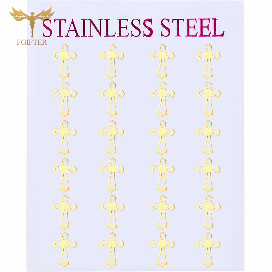 Enhance your collection with this 12-pair set of stainless steel cross stud earrings, designed for women who appreciate meaningful Christian accessories. Crafted from high-quality, anti-allergic stainless steel, these earrings offer durability and a lasting gold finish that won’t fade. Perfect for everyday wear or special religious occasions, each pair features a secure push-back design for comfortable, reliable use. This wholesale pack provides versatile, stylish options to express your faith with elegance and confidence.
