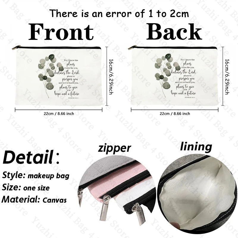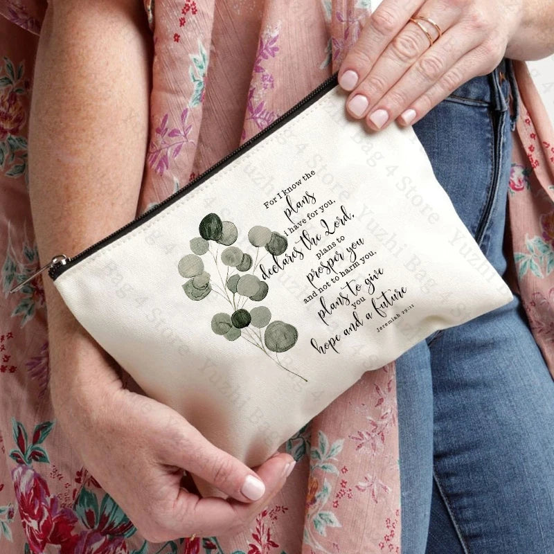 Bible Scripture Jeremiah 29:11 for I Know The Plans Watercolor Eucalyptus Leaf Pattern Makeup Cosmetic Bag Christian Religious