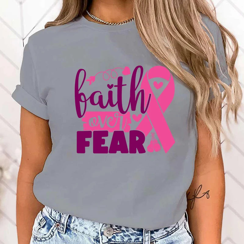 Show your support for breast cancer awareness with our (High Quality Clothes) Hot Breast Cancer Awareness Faith Over Fear Graphic T Shirt. Made from soft and durable materials, this women's fashion t-shirt is not only stylish, but also comfortable to wear. With a powerful message of "Faith Over Fear", this short sleeve shirt is perfect for inspiring and empowering women everywhere. Join the fight against breast cancer in style!